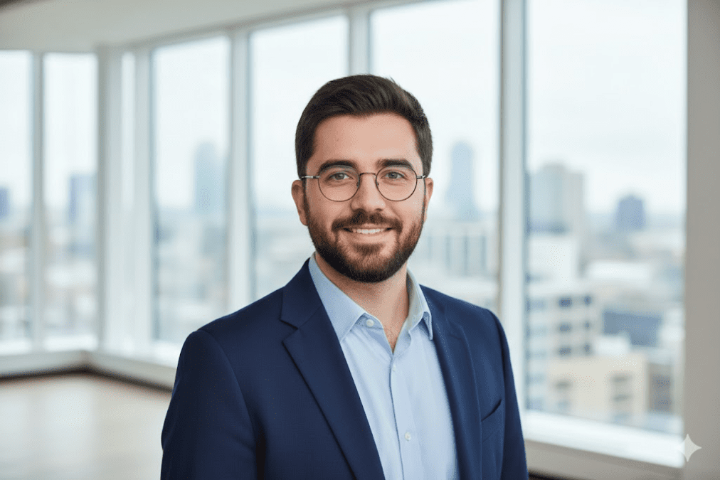 Turn this selfie into a professional LinkedIn headshot of a man. Background: softly blurred office with big windows. Style: clean, realistic, subtle retouching, no heavy filters. Lighting: soft daylight from the front. Constraints: keep facial features and hairstyle accurate, no text.