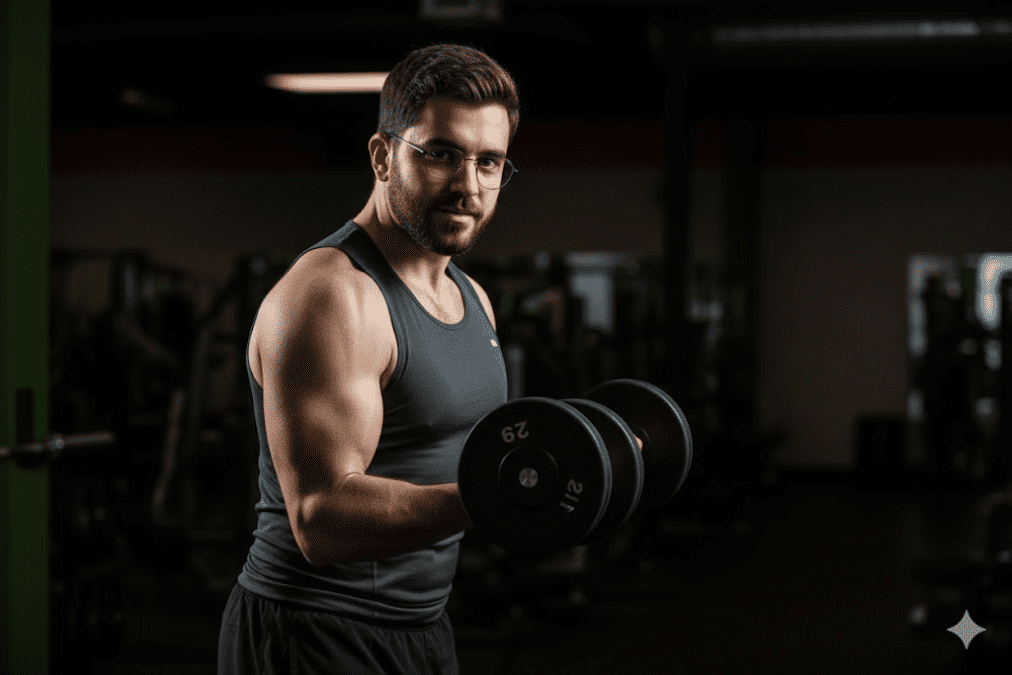 Transform this gym selfie into a fitness magazine-style photo of a man mid-workout. Lighting: dramatic side lighting emphasizing muscles, dark background. Style: realistic, high contrast, crisp details, no overdone smoothing. Constraints: keep body shape natural and realistic.