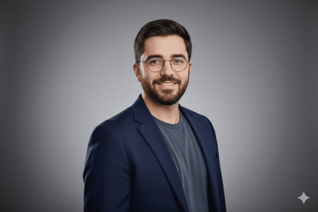 Create a studio portrait of a man wearing a dark blazer over a plain T-shirt. Background: neutral grey gradient. Lighting: softbox-style portrait lighting, gentle shadows. Style: realistic, sharp details, suitable for website “About” page.
