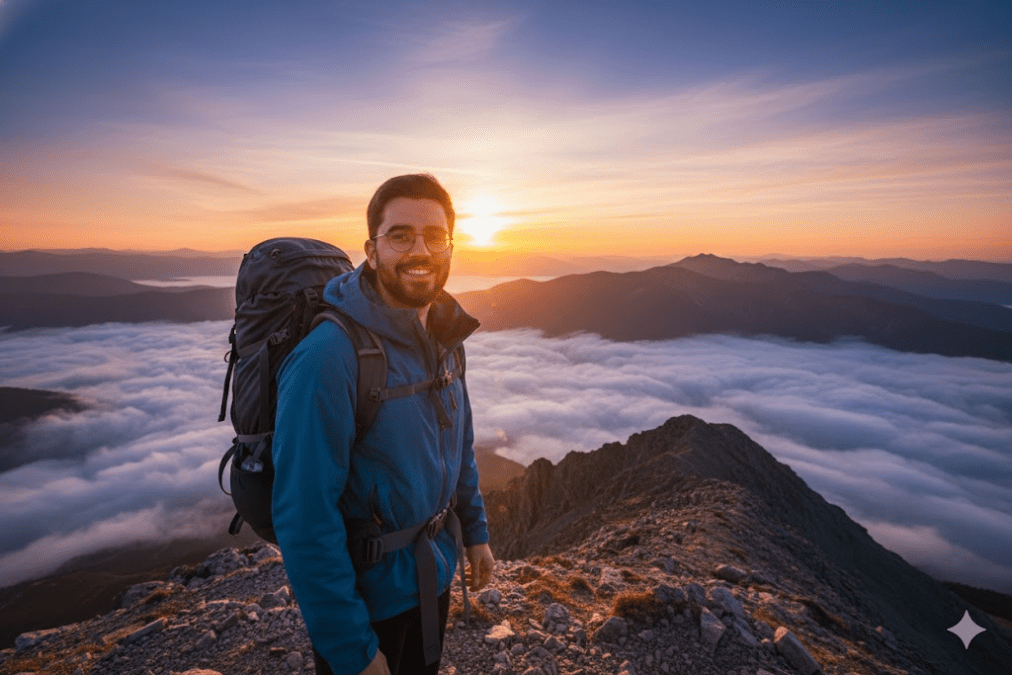 Turn this photo into an image of a man standing on a mountain viewpoint at sunrise. Add: clouds below, golden light on the face. Outfit: hiking jacket and backpack. Style: cinematic landscape, rich colors, wide-angle perspective. Instagram-ready