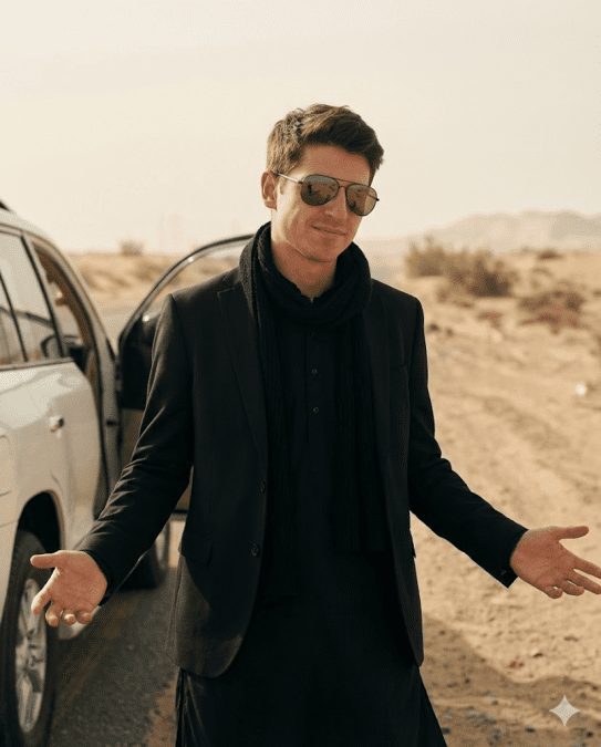 Transform my uploaded photo into an ultra-realistic cinematic film still while preserving my exact identity (same facial structure, age, skin texture, hairstyle; no beautification; no face change). Scene: dusty desert roadside with soft beige haze; a white SUV on the left with the door open behind me. Wardrobe: all-black layered outfit — black kurta with buttons, black blazer/coat, and a black scarf/stole draped around the neck. Accessories: dark aviator sunglasses, symmetric fit, realistic lens reflections. Pose/expression: confident smirk, head slightly down and turned; both arms open outward with palms up; hands anatomically correct. Lighting: warm daylight, gentle contrast, soft shadows, subtle film grain; cinematic color grading. Camera: medium shot, slightly low angle, shallow depth of field; face tack-sharp, background softly blurred. Output: Instagram feed portrait, 4:5 aspect ratio, 1080×1350, high detail. Constraints: no text, no logos/brands, no watermark, no extra fingers, no warped hands, no duplicate limbs, no plastic skin.