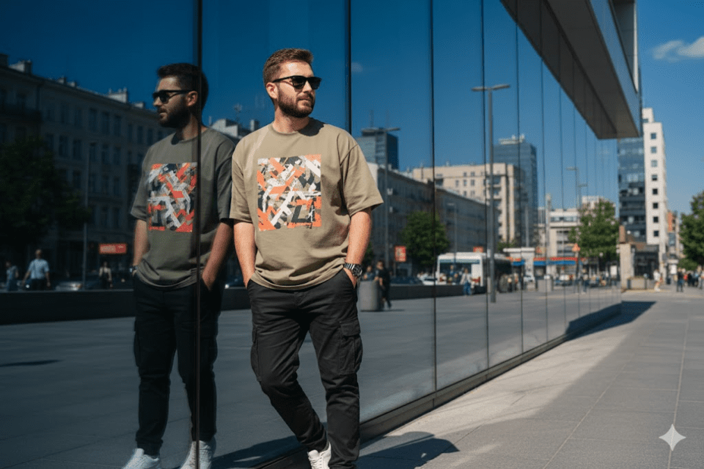 Edit my uploaded photo into a candid, high-realism street photograph while preserving my original facial identity and hairstyle accurately. Show me leaning casually against a large glass building wall on a sunny day. Outfit: oversized khaki graphic t-shirt with an abstract orange, white, and black print; black cargo pants with multiple pockets; white sneakers; sunglasses; wristwatch. Pose: hands in pockets, looking to the side casually. Include a clear reflection on the glass surface behind me. Background: urban cityscape with a clear blue sky. Lighting: bright direct sunlight creating sharp shadows. Natural photography look, high realism. Vertical 4:5 composition.