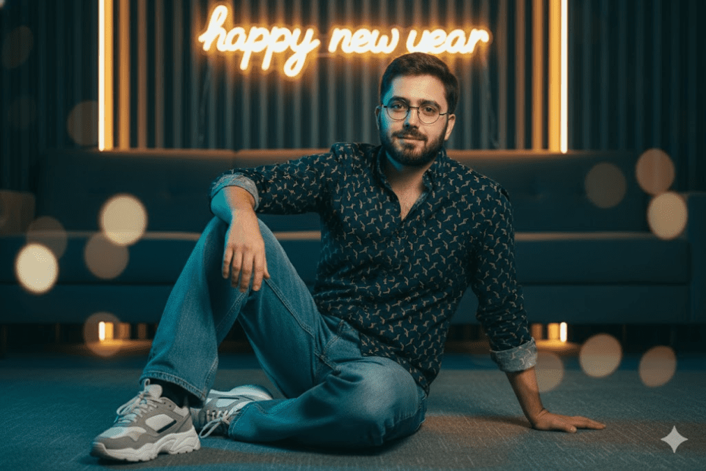Edit my uploaded photo into an ultra-realistic cinematic portrait while preserving my face and identity accurately. Keep my facial features, skin tone, and likeness the same. Place me sitting casually on the floor in a modern neon-lit lounge, relaxed and confident pose, with a soft romantic expression. Outfit: a navy blue shirt featuring a yellow-gold geometric linear pattern, baggy denim pants, and chunky sneakers. Lighting: cool blue ambient light on the subject, warm yellow background, and a yellow glow behind the hair (halo effect). Background: a designed wall backdrop with a softly glowing neon sign that reads ‘happy new year’. Ultra-realistic detail, cinematic color grading, shallow depth of field.