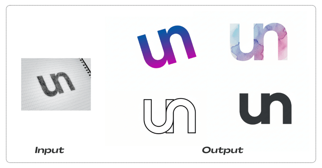 Turn this rough logo sketch into 8 professional logo variations: 1) Minimalist black line art on white. 2) Gradient blue-to-purple modern tech style. 3) Vintage badge with subtle distressed texture. 4) Neon glow logo on a dark background. 5) Watercolor artistic interpretation with soft edges. 6) Bold geometric version with simplified shapes. 7) Gold foil embossed look on dark card stock. 8) Hand-lettered organic style with natural curves. Keep the core logo concept and symbol recognizable in every variation, but explore clearly different visual directions. Present all 8 versions in a 4×2 grid, each variation clearly separated with a small label beneath it. High resolution, 4K, suitable for client presentations.