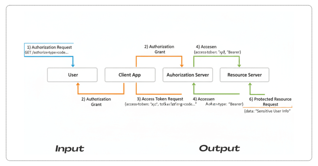 Turn this into a clean OAuth 2.0 flow diagram for technical documentation. Include these exact components: - User - Client App - Authorization Server - Resource Server Use color coding: - User actions: blue (#2196F3) - Successful responses: green (#4CAF50) - Authorization steps: orange (#FF9800) Add labeled arrows: 1) Authorization Request 2) Authorization Grant 3) Access Token Request 4) Access Token 5) Protected Resource Request 6) Protected Resource Use a modern, minimalist design with plenty of white space. Include small code snippet callouts in monospace font near key arrows. Export at 2000×2000, optimized for embedding in documentation.