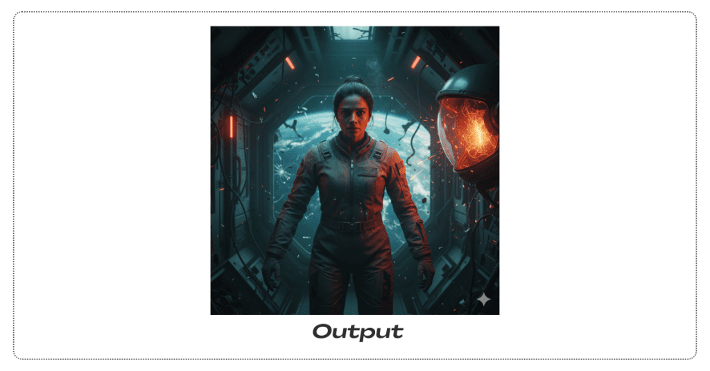 Create a cinematic still from a sci-fi thriller. Subject: Indian female astronaut, early 30s, determined expression, hair in a tight bun. She is floating in zero gravity inside a damaged spacecraft corridor. Camera: - 35mm lens equivalent - f/2.8 aperture for shallow depth of field - Eye-level medium shot (waist up) Lighting: - Single harsh key light from a sparking control panel on the right (orange-red glow) - Soft blue rim light from Earth visible through a cracked viewport behind her - Dim red practical lights from emergency strips along the corridor Details: - Floating debris catching light - Visible breath condensation in the cold air - Torn mission patch on her suit shoulder - Reflection of corridor damage in her helmet visor Color grade: Teal and orange, slightly desaturated for tension. 4K resolution, 2.39:1 cinematic aspect ratio.