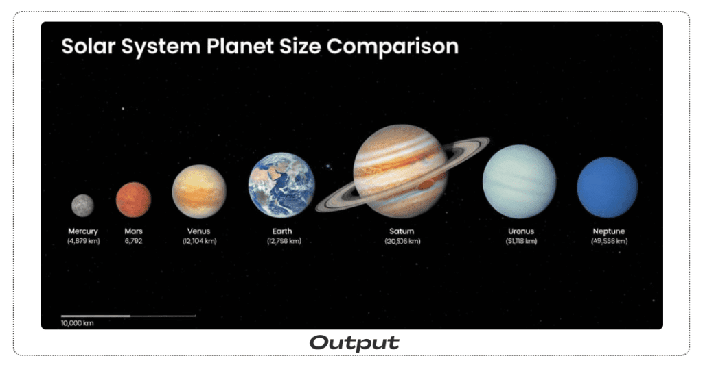 Create an educational infographic comparing the diameters of the 8 planets in our solar system using these values (in km): Mercury 4,879 Venus 12,104 Earth 12,756 Mars 6,792 Jupiter 142,984 Saturn 120,536 Uranus 51,118 Neptune 49,528 Show all 8 planets to scale relative to each other, arranged horizontally in order from the Sun. Use scientifically accurate colors and textures for each planet. Label each planet with its name and exact diameter in a clean sans-serif font. Add a scale bar labeled “10,000 km” for reference and a title at the top: “Solar System Planet Size Comparison”. Background: deep space black with subtle stars. Poster size: 24×36 inches, 300 DPI, suitable for classroom printing.